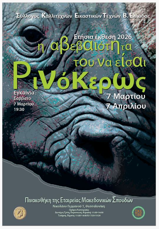 Συμμετοχή στην έκθεση “Η αβεβαιότητα του να είσαι Ρινόκερως”, η οποία βασίστηκε στο θεατρικό έργο του Ευγένιο Ιονέσκο, θέατρο του παραλόγου, και γίνεται με σκοπό την ανάπτυξη και διάδοση του πολιτισμού και των εικαστικών τεχνών στη Βόρεια Ελλάδα, σε συνεργασία με την Εταιρεία Μακεδονικών Σπουδών Θεσσαλονίκης (ΕΜΣ), ( Νικολάου Γερμανού 1, 6ος όροφος).