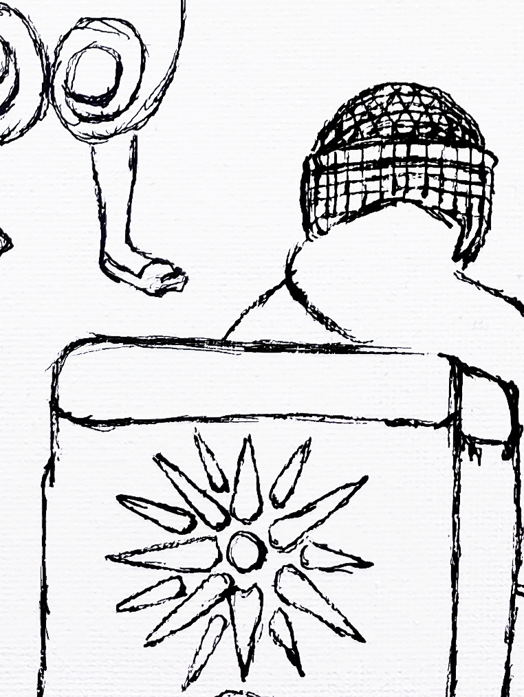 Αναστασία Ζωή Σουλιώτου, κράνος – ΚΤΕΛ Μακεδονίας, λεπτομέρεια του πίνακα Φόρα την πόλη και θα γίνεις φόρεμά της ! (2025), μελάνι και ακρυλικά σε καμβά, 30 εκ Χ 40 εκ – Anastasia Zoi SOULIOTOU, helmet – KTEL Macedonia dome, detail of the painting Wear the City and You Will Become Its Dress! (2025), ink and acrylics on canvas, 30 cm X 40cm.