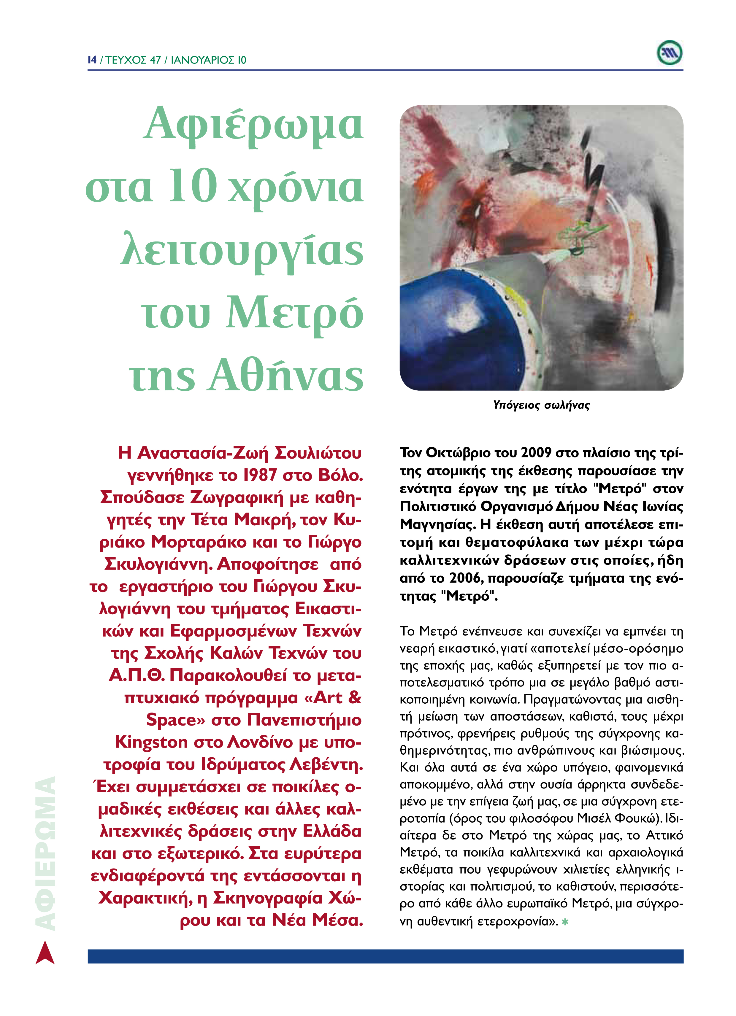 Αφιέρωμα στα 10 Χρόνια Λειτουργίας του Μετρό της Αθήνας, Περιοδικό: Ο ΚΟΣΜΟΣ ΤΟΥ ΜΕΤΡΟ, Τεύχος 47, Ιανουάριος 2010, σελ: 14-16