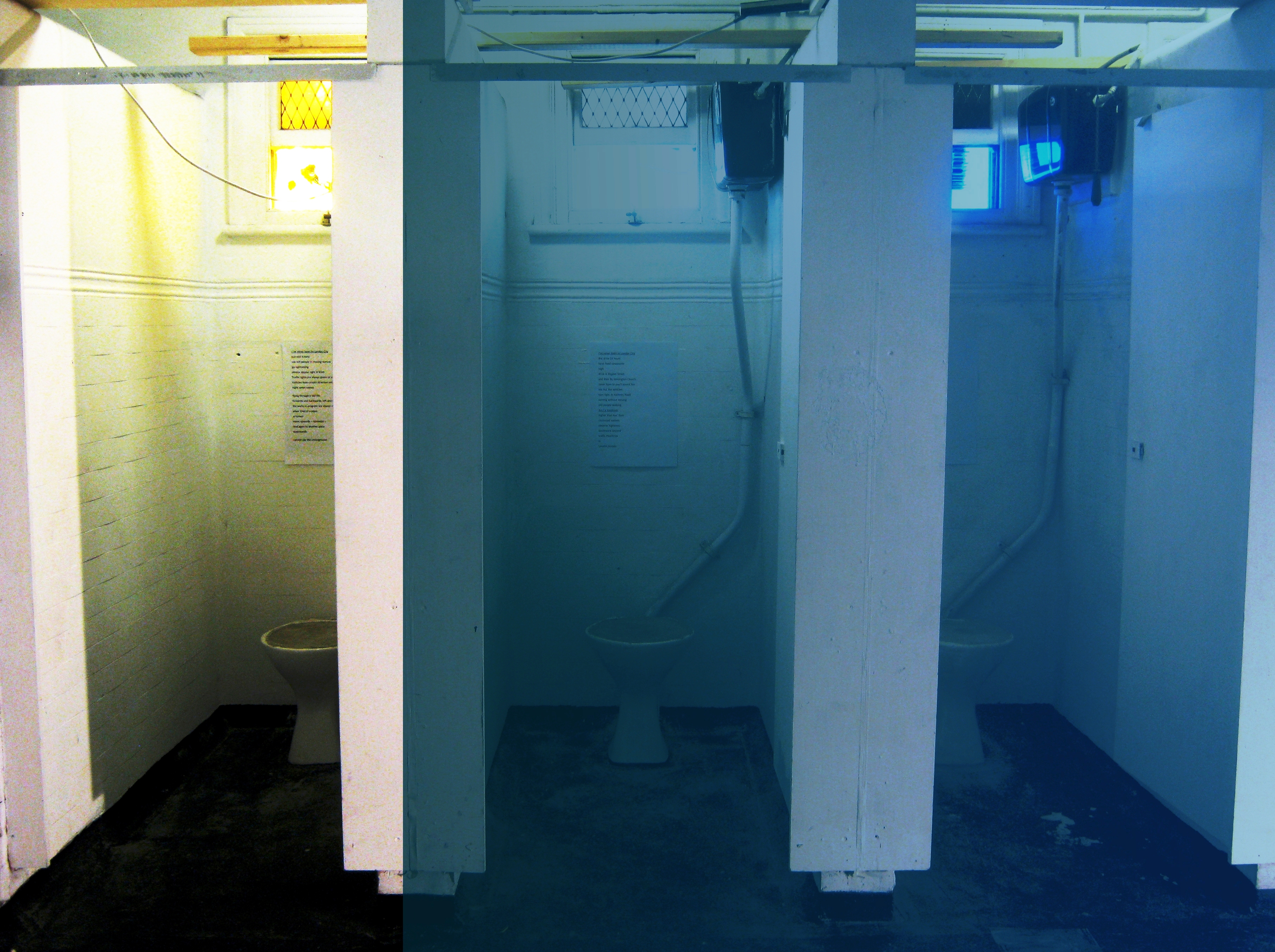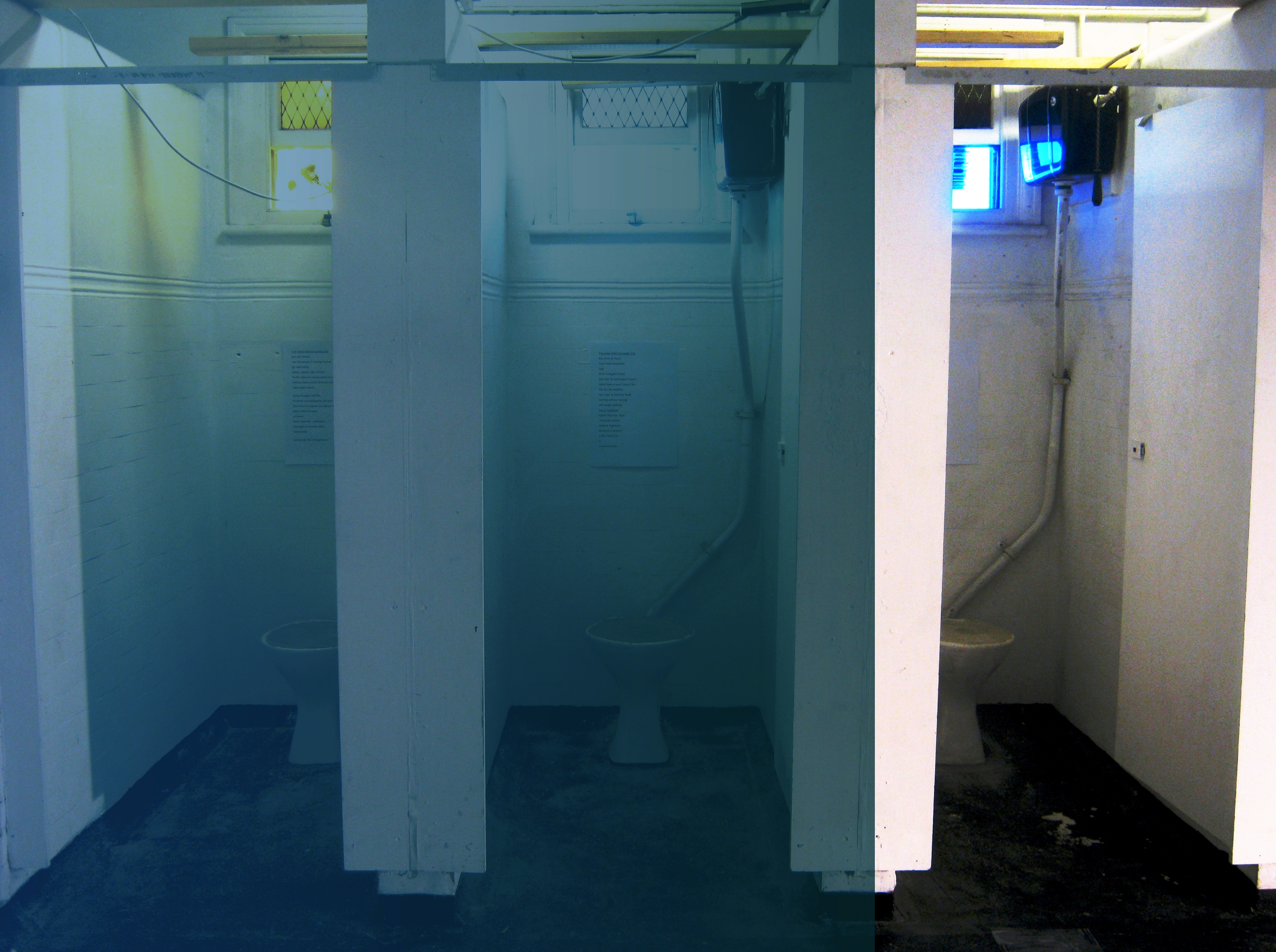 The above Poetic Trilogy was exhibited in the cubicles of Toilet Gallery. Each poem was showed in the cubicle indicated by the image on the right hand side (the cubicle which is not covered by the blue tint corresponds to the cubicle where the poem was showed).