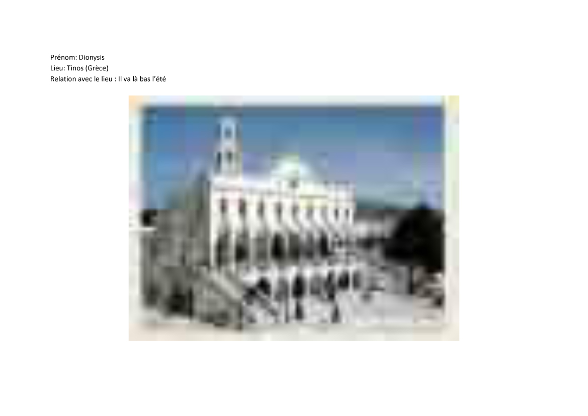 - prénom: Dionysis, Lieu: Tinos, Grèce (le lieu où il va l’août)