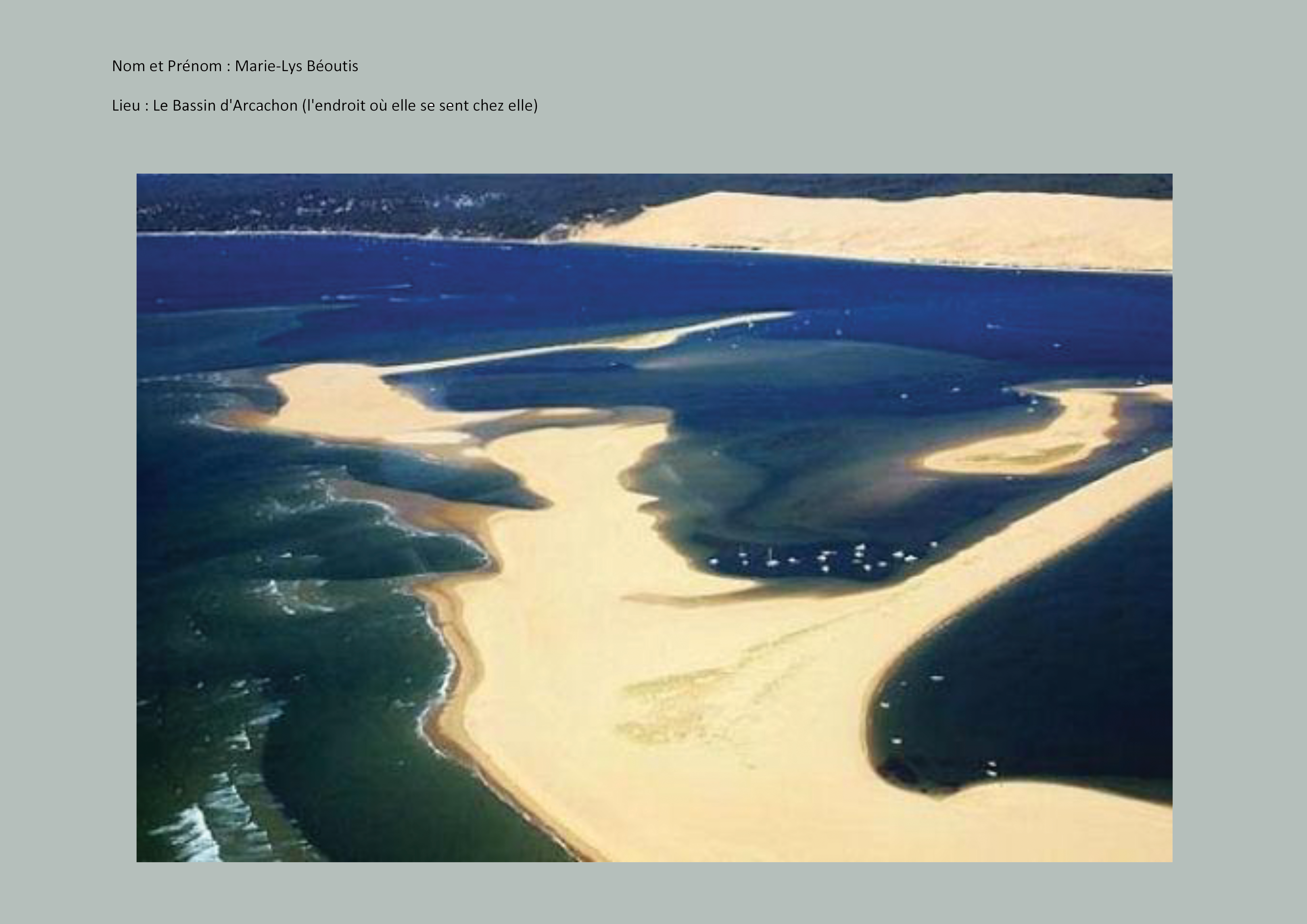- prénom et nom: Marie-Lys Béoutis, Lieu: Bassin d’Arcachon (l’endroit où elle se sent chez elle).