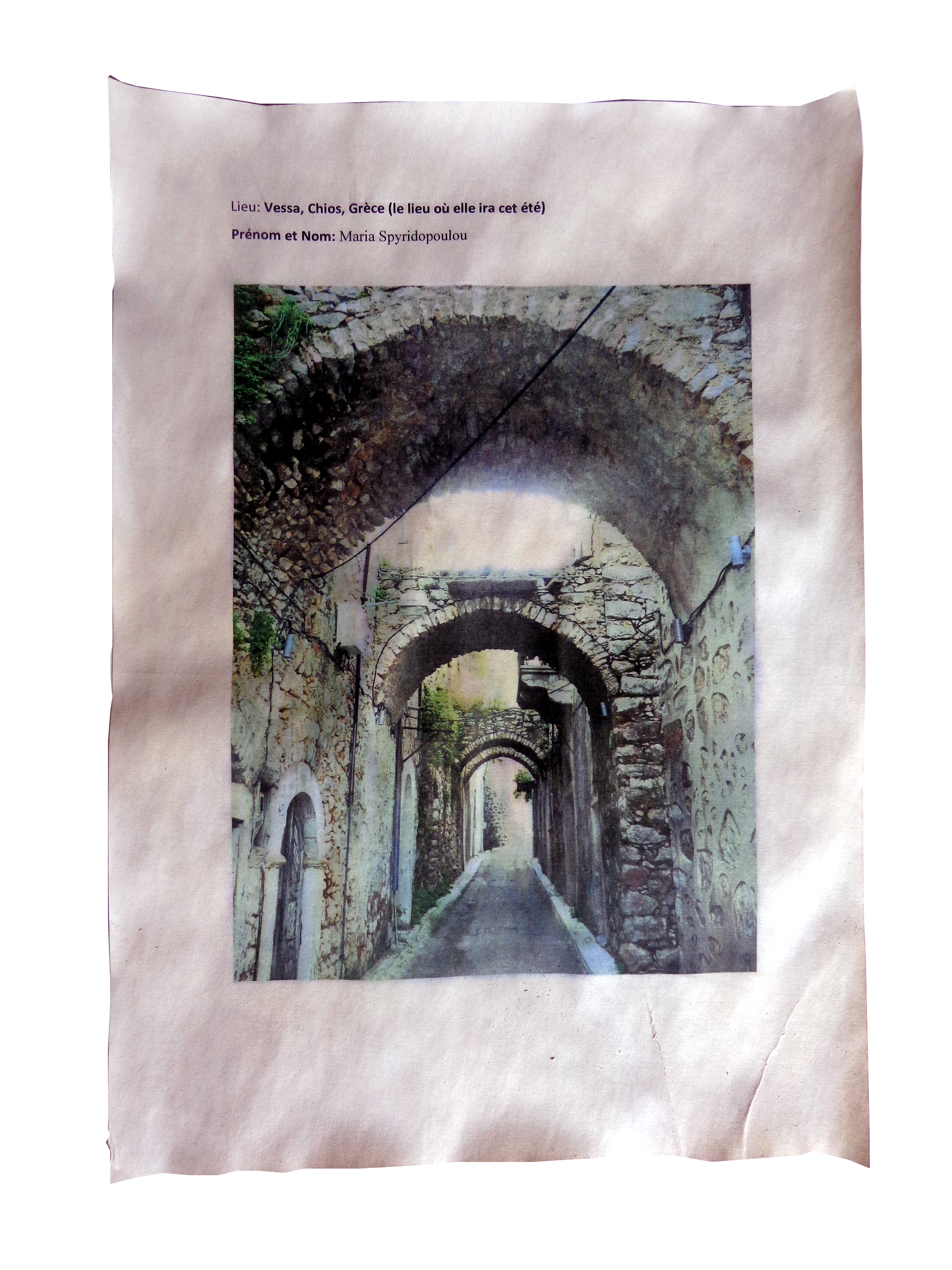 - prénom et nom: Maria Spyridopoulou, lieu: Vessa, Chios, Grèce (le lieu où elle ira cet été)