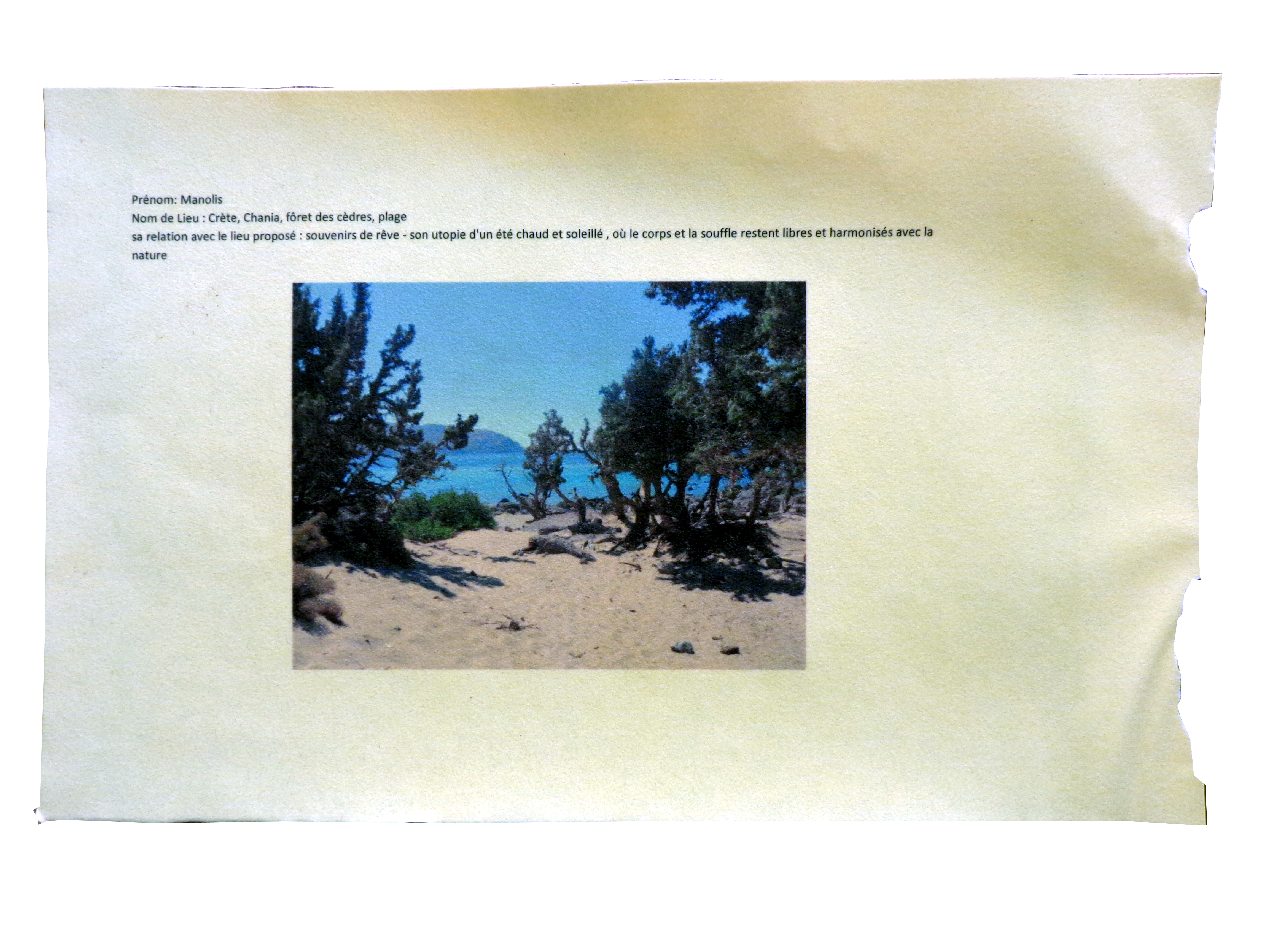 - prénom: Manolis, lieu: Crète, Chania, fôret des cèdres, plage (relation avec ce lieu : souvenirs de rêve – son utopie d’un été chaud et soleillé , où le corps et la souffle restent libres et harmonisés avec la nature)
