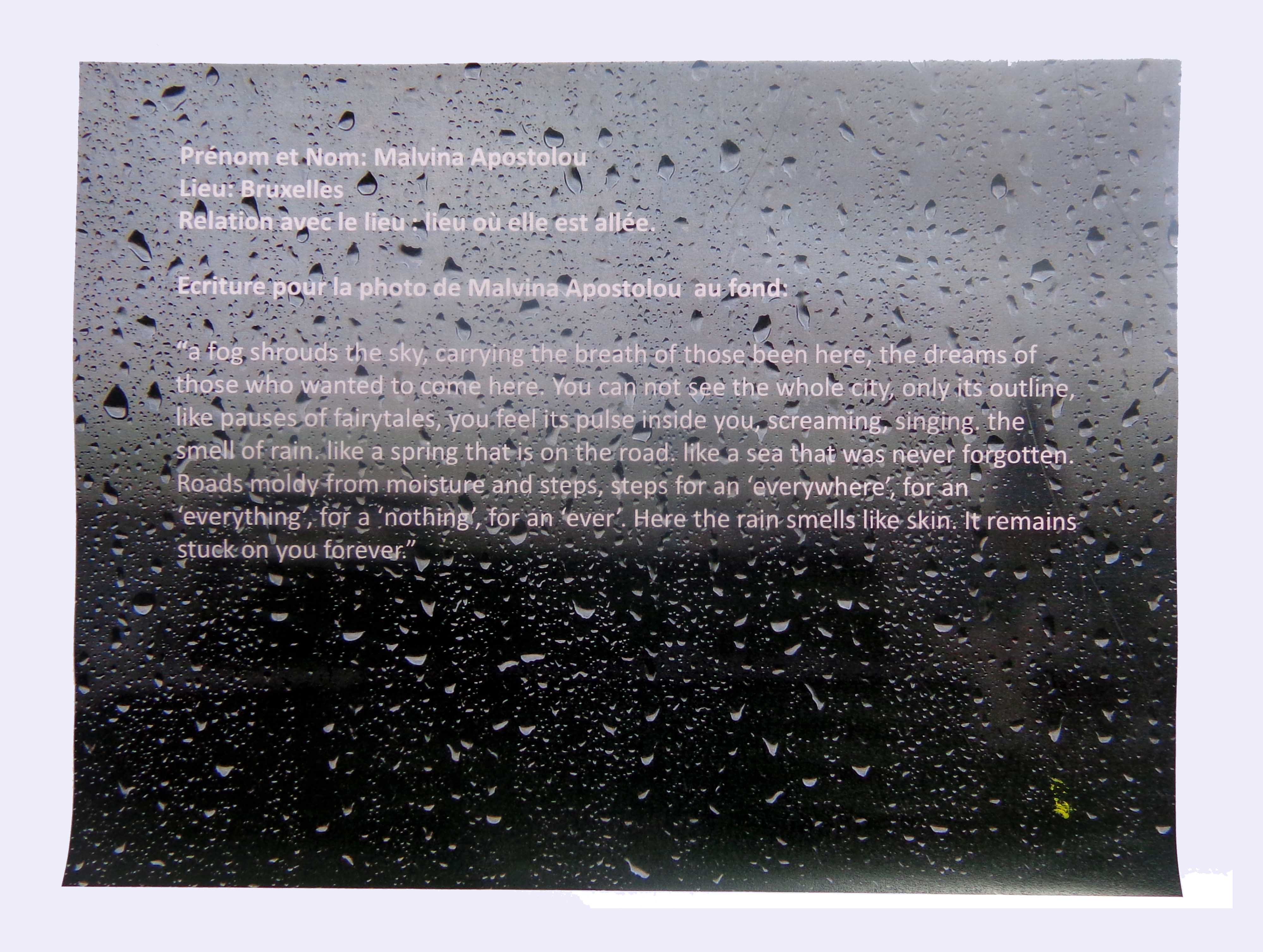- prénom et nom: Malvina Apostolou, Lieu: Bruxelles (lieu où elle est allée)