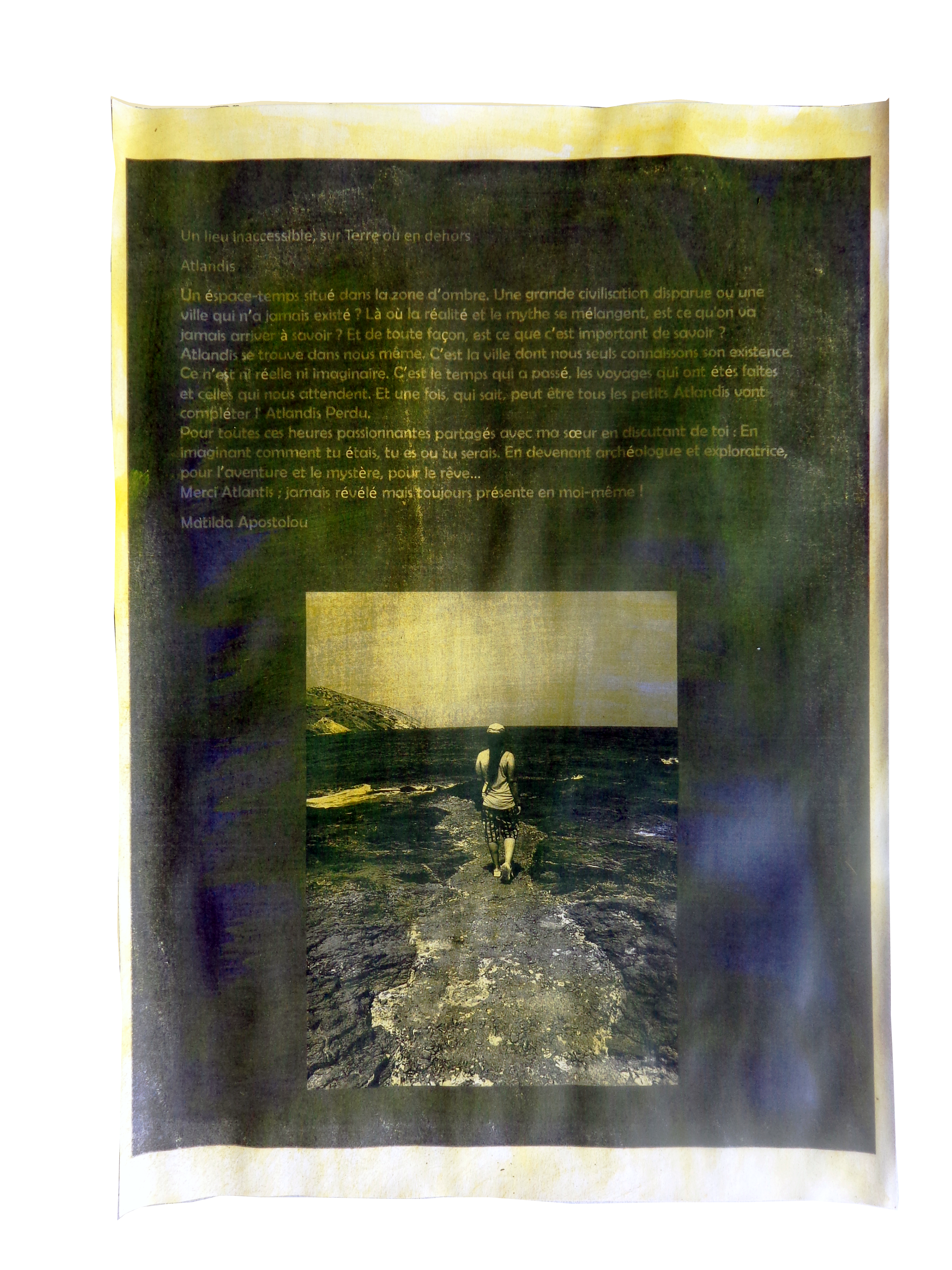 ( “Un lieu inaccessible, sur Terre ou en dehors. Un éspace-temps situé dans la zone d’ombre. Une grande civilisation disparue ou une ville qui n’a jamais existé ? Là où la réalité et le mythe se mélangent, est ce qu’on va jamais arriver à savoir ? Et de toute façon, est ce que c’est important de savoir ? Atlandis se trouve dans nous même. C’est la ville dont nous seuls connaissons son existence. Ce n’est ni réelle ni imaginaire. C’est le temps qui a passé, les voyages qui ont étés faites et celles qui nous attendent. Et une fois, qui sait, peut être tous les petits Atlandis vont compléter l’ Atlandis Perdu. Pour toutes ces heures passionnantes partagés avec ma sœur en discutant de toi : En imaginant comment tu étais, tu es ou tu serais. En devenant archéologue et exploratrice, pour l’aventure et le mystère, pour le rêve…Merci Atlantis ; jamais révélé mais toujours présente en moi-même !” texte par Matilda Apostolou)