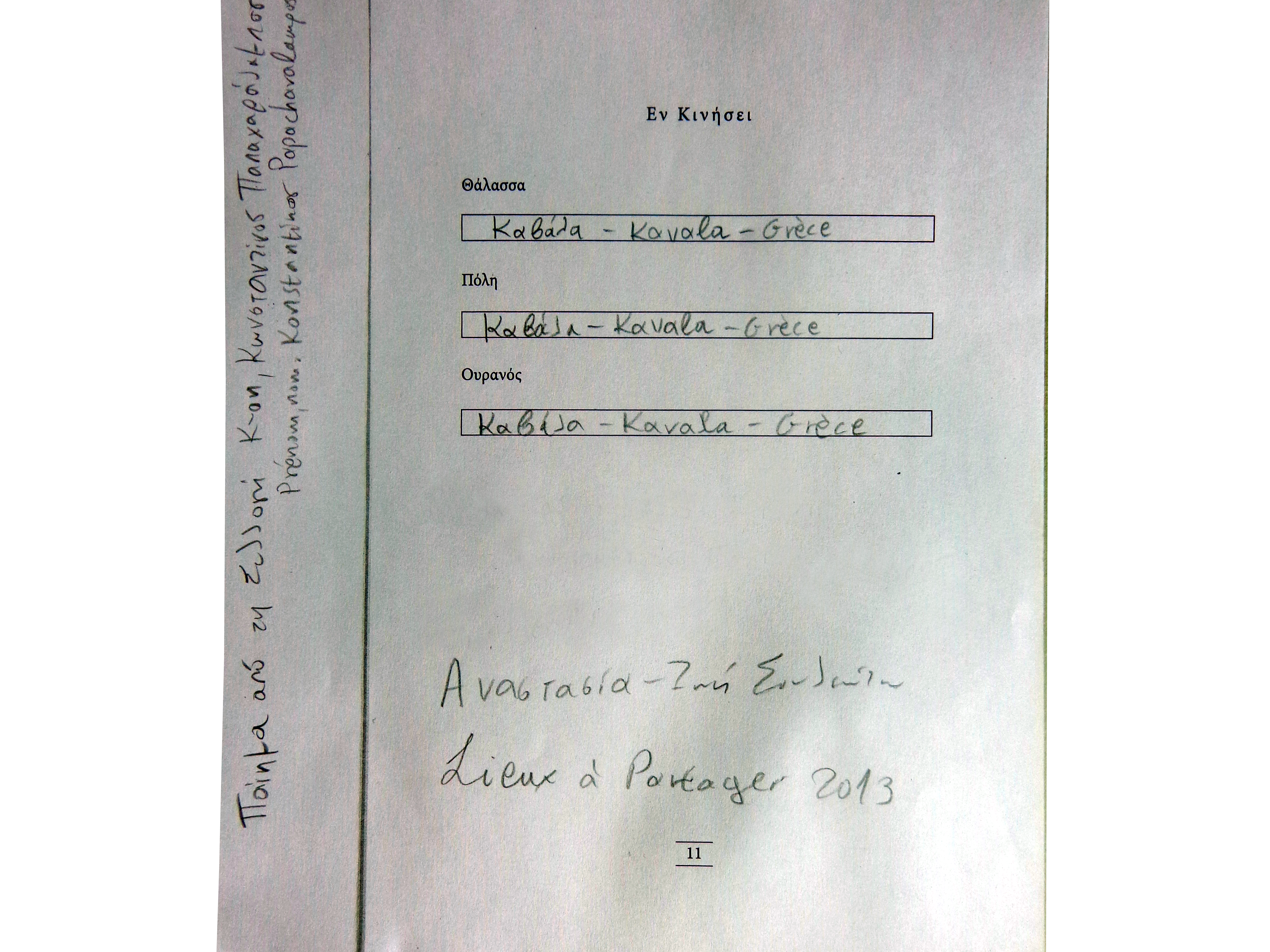 Matériaux: écriture au crayon sur photo-copie du poème “Εν Κινήσει” du participant