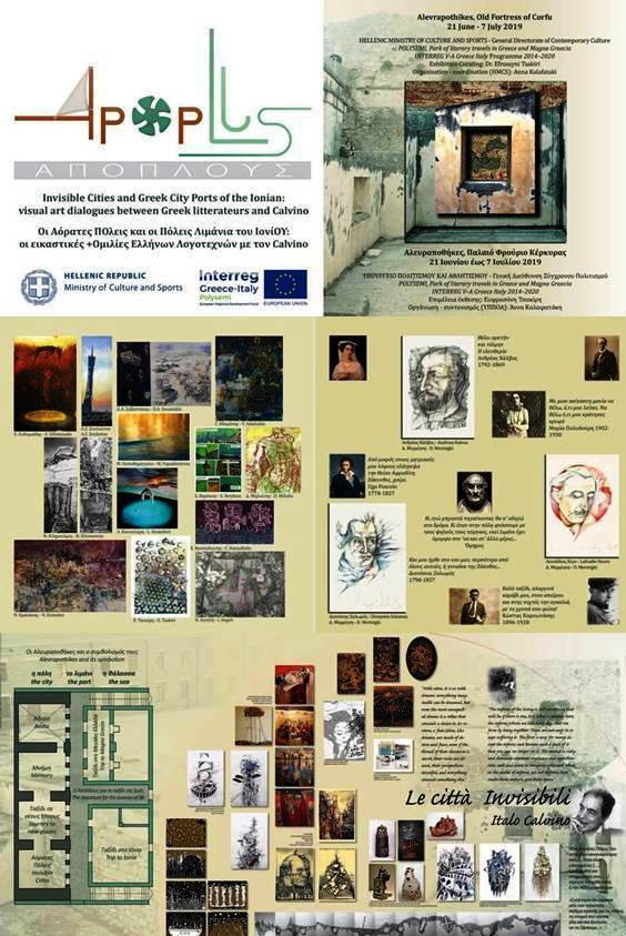 The Exhibition APOPLUS, Invisible Cities and Greek City Ports of the Ionian: visual art dialogues between Greek litterateurs and Calvino, is organized by the Hellenic Ministry of Culture and Sport, General Directorate of Contemporary Culture, in the framework of the action “Park of literary travels in Greece and Magna Graecia”, with the acronym POLYSEMI of the “INTERREG V-A Greece Italy Programme 2014-2020”. The exhibition was hosted at Alevrapothikes building in the Old Fortress of Corfu. The exhibition was inaugurated on June 21 and ran until 7 July 2019.
